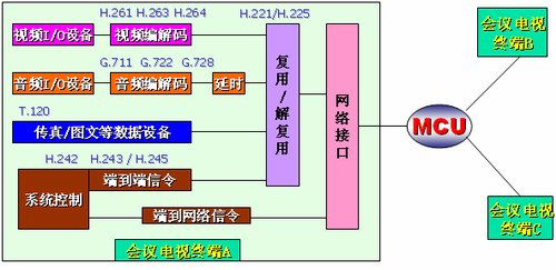 如圖所示:視頻會(huì)議終端將輸入進(jìn)來的視頻使用H.261、H.263或H.264協(xié)議、音頻使用G.711、G.722或G.728、數(shù)據(jù)、控制信令進(jìn)行單獨(dú)編碼,然后將編碼后的數(shù)據(jù)進(jìn)行“復(fù)用”打包后形成遵循網(wǎng)絡(luò)協(xié)議的數(shù)據(jù)包,通過網(wǎng)絡(luò)接口傳到MCU供選擇廣播。從MCU傳來的其他會(huì)場(chǎng)的數(shù)據(jù)包通過“解復(fù)用”,分別還原成視頻、音頻以及數(shù)據(jù)及控制信令分別相應(yīng)的輸出設(shè)備上回顯或執(zhí)行。
