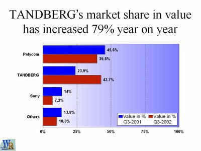 產(chǎn)地挪威,該品牌為視頻會(huì)議業(yè)界的高端產(chǎn)品。該品牌全系列均屬第三代產(chǎn)品,具有多項(xiàng)視頻會(huì)議的首創(chuàng)技術(shù),最高功耗只有65W,最高帶寬3M,是美國國防部、加拿大國防部、聯(lián)合國教科文組織、歐洲多個(gè)國家王室及大型跨國集團(tuán)選用的品牌,F(xiàn)在全球市場(chǎng)占有量第一位(依據(jù)2002年第3季度資料)。