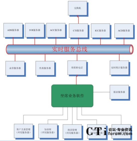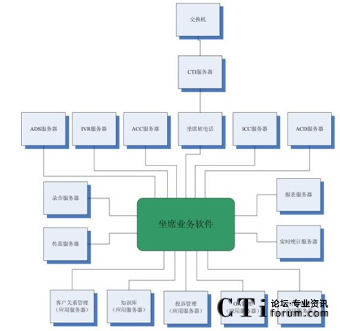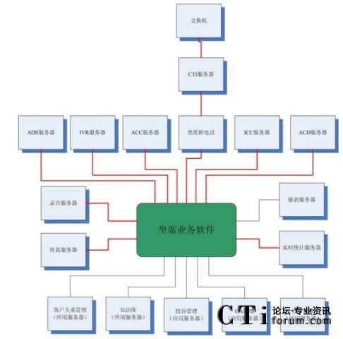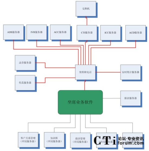 很多集成商或業(yè)務(wù)軟件開發(fā)商認(rèn)為這種結(jié)構(gòu)過于復(fù)雜,而他們自身往往提供“整體解決方案”,即所有的服務(wù)器軟件基本上都是自己的,根據(jù)客戶的要求修改即可。例如,客戶關(guān)系管理、知識庫、投訴管理、OA、訂單管理以及坐席軟電話、ADS服務(wù)器、IVR服務(wù)器、ACC服務(wù)器、ICC服務(wù)器、ACD服務(wù)器、錄音服務(wù)器、傳真服務(wù)器、報表服務(wù)器、實時統(tǒng)計服務(wù)器都是自己來做,那么對于很多接口環(huán)節(jié)都可以節(jié)省了。
