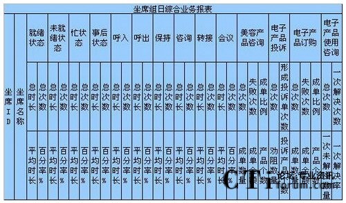 c)如果想對(duì)這個(gè)組的坐席進(jìn)行整體的坐席狀態(tài)進(jìn)行考核,以便確定工作負(fù)荷、績(jī)效考核,形成每天、每月、每季度、每年、按組、按技能,平均、總計(jì)、總合、最大、最小數(shù)據(jù)比較的表格、圖表,對(duì)不起要么你放棄這個(gè)想法,要么你重新開(kāi)發(fā)軟件進(jìn)行計(jì)算。