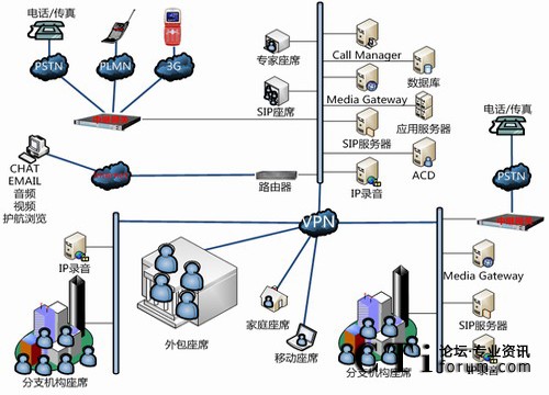 分布接入、分布座席、集中管理:由獨(dú)立接入、獨(dú)立座席的多個子系統(tǒng)組成一個完整系統(tǒng)。接入、座席、IVR/FAX 分布,但系統(tǒng)可統(tǒng)一處理、統(tǒng)一監(jiān)控、統(tǒng)一管理。
