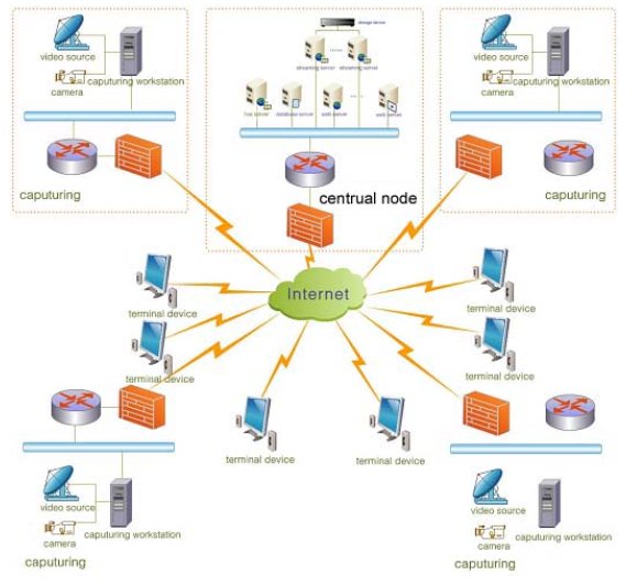各單位內(nèi)部發(fā)部是通過組播實(shí)現(xiàn),同一網(wǎng)段進(jìn)行一路信號的組播。并上傳一路至總部的總中心機(jī)房,不同單位的用戶可以局域內(nèi)觀看。每個(gè)單位中心機(jī)房有自己內(nèi)部的視頻點(diǎn)播服務(wù)器,利用該系統(tǒng)各單位將所有的資料放置在網(wǎng)上,供其它部門的指戰(zhàn)員進(jìn)行點(diǎn)播。