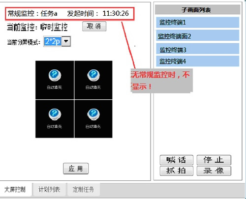 監(jiān)控計劃規(guī)定了監(jiān)控系統(tǒng)何時以何種方式在大屏上顯示多個現(xiàn)場的監(jiān)控畫面。監(jiān)控畫面可輪詢,可調(diào)整設(shè)置畫面分屏顯示模式;可以固定在某位置顯示某監(jiān)控畫面;可以切換到險情聯(lián)動監(jiān)控模式。可以與監(jiān)控畫面喊話;監(jiān)控錄像;保存畫面等功能。