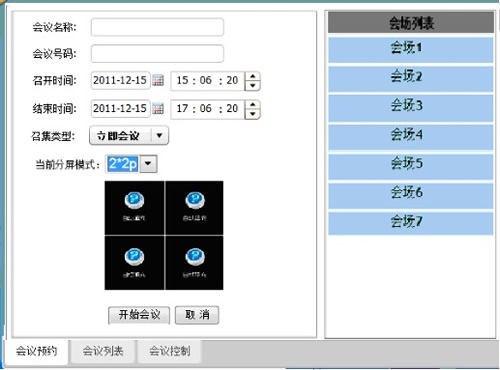 在調(diào)度臺界面主界面,點擊“視頻會議”按鈕,在終端區(qū)選擇會場,再次點擊“視頻會議”按鈕,界面切換到會議設(shè)置界面,進(jìn)行相應(yīng)的設(shè)置,點擊“開始會議”按鈕即可。