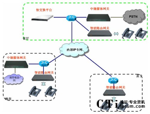 通過(guò)上述三環(huán)節(jié),即在財(cái)政內(nèi)部網(wǎng)上建立了一套跨區(qū)域的電話(huà)系統(tǒng)。拓?fù)涫疽鈭D如下: