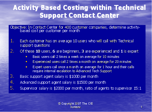 呼叫中心業(yè)務(wù)包括大量單獨的行動 — 行動成本法(ABC)使我們跟蹤那些行動以至于更清楚地了解支持一個客戶的所需事項。傳統(tǒng)上,呼叫中心成本是根據(jù)投入來衡量的:人數(shù),設(shè)備量,設(shè)施的規(guī)模。為了了解服務(wù)一個客戶所花費的成本量,呼叫中心的主管必須確定這些行動如何與該客戶相聯(lián)系的。只有做到這一點,行業(yè)才能知道來自該客戶的收入是否超出為其提供服務(wù)所產(chǎn)生的成本。如果服務(wù)的成本大于收入,那么這個客戶對于行業(yè)來說是無利可圖的,所以確定哪些客戶有利可圖和哪些客戶無利可圖是很重要的,這樣,行業(yè)才可以根據(jù)客戶定價和客戶服務(wù)策略有利地進行管理。