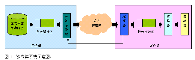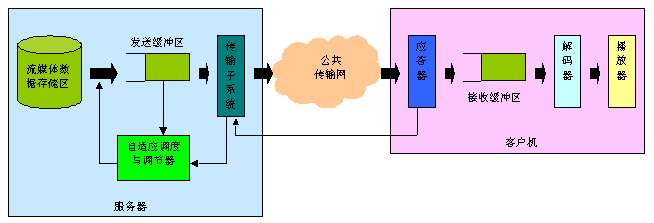 實時自適應(yīng)網(wǎng)絡(luò)帶寬的流媒體傳送技術(shù),是上海清鶴數(shù)碼科技公司的一項可大幅提高流媒體寬帶傳送過程中的關(guān)鍵服務(wù)質(zhì)量瓶頸的國際技術(shù)專利。我們知道,目前制約流媒體寬帶應(yīng)用發(fā)展的核心問題在于服務(wù)質(zhì)量。簡單地說,由于因特網(wǎng)的狀況是不可靠的,其帶寬、負(fù)荷等變化劇烈,這難以滿足流媒體寬帶業(yè)務(wù)的實時性服務(wù)質(zhì)量要求,并常常造成播放卡殼、延遲、視頻質(zhì)量抖動劇烈等不良情況,給使用者感官造成很大影響。所以解決好流媒體寬帶應(yīng)用的服務(wù)質(zhì)量問題對于流媒體寬帶應(yīng)用是極為重要的。如圖1所示,在一般的流媒體寬帶系統(tǒng)里,視頻服務(wù)器通過網(wǎng)絡(luò)向客戶機實時傳送流媒體信息。