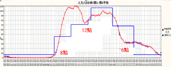大家看到圖一中紅色的線,就是一天里面電話進(jìn)來(lái)的數(shù)量,藍(lán)色的線是安排的人力。可以清楚看到:早上8點(diǎn)一開(kāi)始,電話就一直進(jìn)來(lái);中午來(lái)電的客戶開(kāi)始去吃飯,電話就開(kāi)始下滑;然后等到客戶吃完中飯,電話又開(kāi)始進(jìn)來(lái),下午又出現(xiàn)另外一個(gè)高峰;一直到5點(diǎn)以后又開(kāi)始下滑,6點(diǎn)以后電話相對(duì)就少很多。