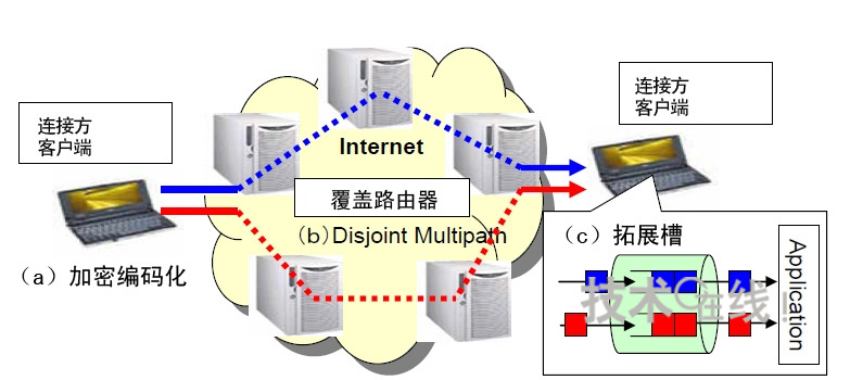 由于是利用多路徑路由發(fā)送分割的數(shù)據(jù),1條路徑被竊聽只會有部分分割數(shù)據(jù)被竊聽。不過,如果發(fā)送分割數(shù)據(jù)的全部路徑都被竊聽,分割數(shù)據(jù)也可能全部流出。為此,此次的秘密通信系統(tǒng)設(shè)想采用基于覆蓋路由器的網(wǎng)絡(luò)(覆蓋網(wǎng)絡(luò)),將全部數(shù)據(jù)被竊聽的可能性減小到了接近0。這是因為覆蓋路由器的通信路徑能夠進行實時切換。此次的保密通話系統(tǒng)將在覆蓋網(wǎng)絡(luò)達到實用化水平時投產(chǎn)實用。計劃在3~4年內(nèi)實現(xiàn)。