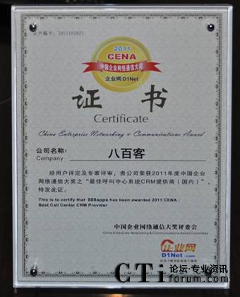 CTI論壇(ctiforum)10月31日消息(記者 張潔):10月19日,2011 秋季CENCE 中國企業(yè)網(wǎng)絡通信大會暨云計算高峰論壇在上海展覽中心盛大舉行。國內(nèi)首家SaaS廠商八百客憑借連續(xù)在云計算領域的成熟技術以及在市場中的廣泛認可度,獲得“最佳呼叫中心系統(tǒng)CRM提供商”大獎。