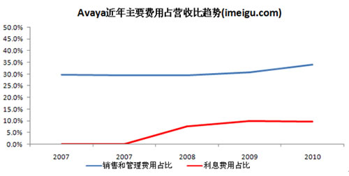 Avaya的成本和費(fèi)用主要由營業(yè)成本、銷售和管理費(fèi)用、研發(fā)費(fèi)用、無形資產(chǎn)攤銷費(fèi)用、利息支出等構(gòu)成。(1)營業(yè)成本主要由硬件費(fèi)用、第三方合作伙伴授權(quán)費(fèi)用以及相關(guān)產(chǎn)品和服務(wù)的人力成本組成,2010財(cái)年?duì)I業(yè)成本占營收比為57.1%;(2)銷售和管理費(fèi)用定義為銷售和市場活動(dòng)以及管理活動(dòng)相關(guān)的工資薪酬、設(shè)備折舊費(fèi)用等等,2010財(cái)年該項(xiàng)費(fèi)用占比達(dá)30.4%;(3)無形資產(chǎn)攤銷主要來自分期攤銷并購NES 時(shí)的客戶關(guān)系價(jià)值,2010財(cái)年占營收比4.3%。(4)利息費(fèi)用即相關(guān)債務(wù)的利息支出和規(guī)避利率風(fēng)險(xiǎn)敞口的金融工具費(fèi)用,2010財(cái)年占營收達(dá)9.6%。
