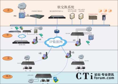 - 地州市分集團放置的二級軟交換系統(tǒng),作為其管轄的縣(市)級分集團和營業(yè)廳的呼叫控制中心,管理和控制其管轄地區(qū)的IP電話終端設(shè)備。