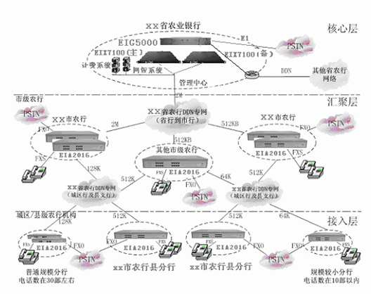 省行、各地市行與縣支行、分理處與數(shù)據(jù)業(yè)務(wù)共用專網(wǎng)線路,實(shí)現(xiàn)VOIP互連,形成一個全省范圍內(nèi)的VOIP大網(wǎng),實(shí)現(xiàn)全省內(nèi)部語音的免費(fèi)通信和內(nèi)部號碼的縮位拔號,節(jié)省了各行間的市話費(fèi)用,節(jié)省大量長途話費(fèi)。各節(jié)點(diǎn)按FXO:FXS