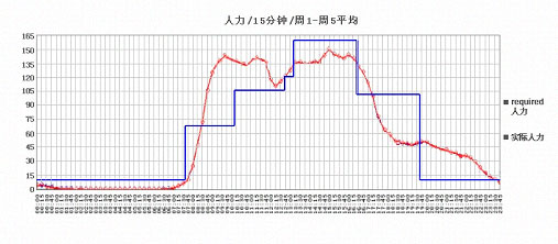 有時候也會畫一張一整個月的電話量和人力比較圖,一般是禮拜一和二的電話最多,也就是把每天的電話總量和上班的人力做個比較,畫出一條每天的曲線圖。