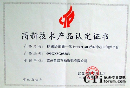 CTI論壇(ctiforum)4月20日消息(記者 楊毅):近日,蘇州盈聯(lián)互動(dòng)數(shù)碼有限公司榮獲江蘇省科學(xué)技術(shù)廳頒發(fā)的高新技術(shù)產(chǎn)品認(rèn)定證書,這標(biāo)志著盈聯(lián)作為一家專業(yè)的呼叫中心解決方案提供商,其產(chǎn)品的先進(jìn)性和高品質(zhì)已獲得了中國技術(shù)部門的官方認(rèn)可。