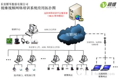 長安轎車大規(guī)模網(wǎng)絡(luò)遠程會議和培訓(xùn)系統(tǒng)由服務(wù)器端和客戶端組成,服務(wù)器端軟件部署在重慶中心機房,中心機房配置1臺單獨服務(wù)器,支持400個客戶端同時在線,負責(zé)所有會議和培訓(xùn)的召集、音視頻交互、加密等工作,長安轎車各部門、轄下各零售點通過WEB方式(包括ADSL、3G無線等多種網(wǎng)絡(luò))即可實現(xiàn)客戶端軟件的自動安裝與升級,配備簡單的攝像頭和話筒之后就可以實現(xiàn)長安轎車以及400多零售點的大規(guī)模工作會議和高清音視頻網(wǎng)絡(luò)培訓(xùn)。網(wǎng)絡(luò)拓撲圖如下: