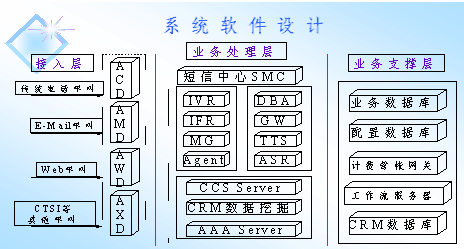 平臺除支持傳統(tǒng)的電話和傳真接入方式之外,還支持短消息方式(用于客戶通知),以后通過擴展各種接入網(wǎng)關(guān)(例如尋呼網(wǎng)關(guān))和內(nèi)容服務(wù)器(例如WWW、E-Mail、WAP等),平臺還支持WAP、WEB、E-Mail、等多種多媒體的接入方式。