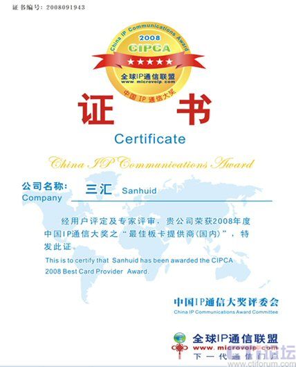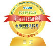 9月19日,在上海盛大舉行的CIPCC中國IP通信大會上,杭州三匯摘取了CIPCA 2008年國內最佳語音板卡提供商大獎,體現(xiàn)了杭州三匯在國內語音卡領域的絕對領導和優(yōu)勢地位。