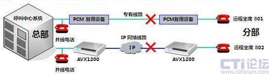 傲威通信采用AVX1200作為中心端和遠程坐席端的復接設備,采用Hotline形式,只要遠程坐席員摘機,中心端的呼叫中心交換機立刻接到摘機指令。當有呼叫到來,遠程坐席可像本地坐席一樣接聽電話,無任何差異。