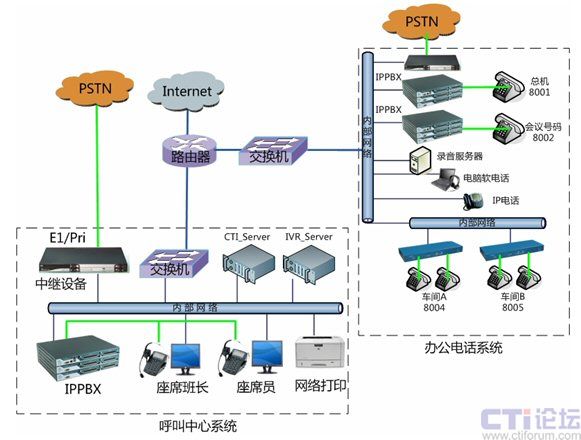 化。在總部核心機房將電話外線中繼接口與中繼網關設備連接,并通過內部網絡對接到IPPBX,分別應用于辦公電話系統(tǒng)和公司呼叫中心系統(tǒng)。設備用于公司辦公電話和公司會議系統(tǒng),可最大支持到30方會議,或多個小型獨立會議系統(tǒng)。各個不同的車間可以采用電話線之間接入分機,或采用傲威AVG800的網關通過網絡接入,并注冊到IPPBX系統(tǒng)實現內網網絡分機。對將來的分公司的辦公電話系統(tǒng),將不再使用傳統(tǒng)的PBX設備,而是直接利用IPPBX系統(tǒng),通過IP