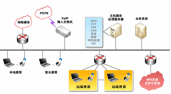 我們可以非常明確的一點是:采用分布式座席的技術(shù),使得遠端座席與中心座席除了地域上的差異,其它部分完全相同。可以說只要網(wǎng)絡(luò)無極限,座席分布就是無極限的。