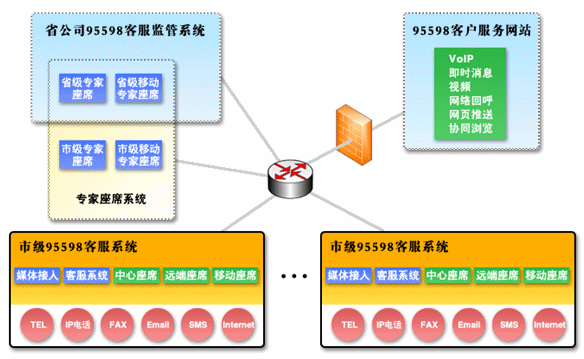 在電力客戶服務(wù)中心系統(tǒng)解決方案中,我們采用了更加先進的第四代呼叫中心系統(tǒng)作為客服系統(tǒng)的平臺?梢詫崿F(xiàn)的客戶聯(lián)絡(luò)方式已經(jīng)不僅僅局限于傳統(tǒng)的語音和傳真的呼叫形式,網(wǎng)絡(luò)電話、網(wǎng)絡(luò)傳真、Email、短消息、即時消息、互聯(lián)網(wǎng)應(yīng)用等都是與客戶聯(lián)絡(luò)的重要方式,涉及到的媒體載體也不僅是PSTN,還有基于VoIP技術(shù)的現(xiàn)代網(wǎng)絡(luò)、無線網(wǎng)絡(luò)等;也就是說第四代呼叫中心系統(tǒng)是一個融合網(wǎng)絡(luò)、語音、數(shù)據(jù)庫、視頻和安全技術(shù)的綜合信息服務(wù)平臺。整個95598電力客戶服務(wù)系統(tǒng)是由呼叫中心子系統(tǒng)和業(yè)務(wù)處理子系統(tǒng)共同構(gòu)成。