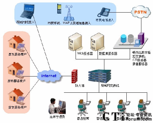 隨著國(guó)內(nèi)城市化地不斷加快,人口老齡化的加劇,人民群眾對(duì)家政服務(wù)需求也越來(lái)越旺盛,家政服務(wù)業(yè)的重要性也日益凸顯。為了規(guī)范家政服務(wù)市場(chǎng)、整合家政市場(chǎng)資源、培育家政服務(wù)示范性企業(yè),國(guó)家商務(wù)部、財(cái)務(wù)部于2009年4月下發(fā)了《關(guān)于推進(jìn)家政服務(wù)網(wǎng)絡(luò)體系建設(shè)的通知》的149號(hào)文件,啟動(dòng)了家政服務(wù)網(wǎng)絡(luò)中心體系建設(shè)的項(xiàng)目,并提出了具體的規(guī)范和要求。以此為起點(diǎn),為更好地服務(wù)社會(huì)滿(mǎn)足人民群眾日益增長(zhǎng)的生活需求而努力。自文件下發(fā)以來(lái),我公司就組織專(zhuān)門(mén)的項(xiàng)目組,對(duì)家政服務(wù)行業(yè)具體業(yè)務(wù)需求的調(diào)研以及開(kāi)發(fā)工作。公司利用多年的開(kāi)發(fā)經(jīng)驗(yàn),經(jīng)過(guò)幾個(gè)月的努力,終于在8月份完成了暢信達(dá)家政服務(wù)網(wǎng)絡(luò)中心的全套建設(shè)方案。與其它系統(tǒng)固化的功能設(shè)計(jì)不同,該方案可以靈活地定制業(yè)務(wù)模塊,方便各地的家政公司根據(jù)本市的情況和需求,確定適合自身的業(yè)務(wù)流程。系統(tǒng)業(yè)務(wù)模塊完整地覆蓋了家政服務(wù)的業(yè)務(wù)范圍與重點(diǎn)。并將家政服務(wù)的業(yè)務(wù)分為營(yíng)業(yè)系統(tǒng)、賬務(wù)系統(tǒng)、后臺(tái)系統(tǒng)等部分,貫穿了市民從訴求提交、工單派發(fā)、工單處理、財(cái)務(wù)結(jié)算到回訪反饋的各個(gè)方面。系統(tǒng)還提供了完善的報(bào)表模塊準(zhǔn)確反映業(yè)務(wù)和系統(tǒng)運(yùn)營(yíng)狀況,有力地支持對(duì)平臺(tái)進(jìn)行運(yùn)營(yíng)管理工作。另外在方案設(shè)計(jì)上,除了滿(mǎn)足業(yè)務(wù)處理需要外,還充分考慮到系統(tǒng)的適應(yīng)性、穩(wěn)定性和處理的能力。首先為了滿(mǎn)足各地市對(duì)家政平臺(tái)的不同需求,公司專(zhuān)門(mén)推出了基于IBM服務(wù)器的和暢信達(dá)標(biāo)配服務(wù)器的兩種建設(shè)方案。暢信達(dá)標(biāo)配服務(wù)器方案可提供最低4模擬外線(xiàn)最多1條數(shù)字中繼(E1)接入,適用于初期規(guī)模較小且投資規(guī)模不大的客戶(hù)。而基于IBM服務(wù)器的方案,則主要是滿(mǎn)足業(yè)務(wù)量較大,同時(shí)對(duì)設(shè)備配置要求高的城市,以數(shù)字線(xiàn)接入為主。多種建設(shè)模式充分體現(xiàn)了方案的靈活性、可擴(kuò)展性的特征,有效地減少了運(yùn)營(yíng)風(fēng)險(xiǎn),提升了個(gè)性化定制化服務(wù)的水平。其次,根據(jù)家政市場(chǎng)需求預(yù)測(cè)以及已開(kāi)通家政服務(wù)網(wǎng)絡(luò)中心城市的實(shí)際運(yùn)營(yíng)情況,一個(gè)中型城市,預(yù)計(jì)電話(huà)開(kāi)通之后,話(huà)務(wù)量平均每天近3000個(gè),這就要求系統(tǒng)不但有穩(wěn)定的性能而且要有強(qiáng)大的處理能力。我公司從系統(tǒng)平臺(tái)構(gòu)建、業(yè)務(wù)流程設(shè)計(jì)、設(shè)備性能、組網(wǎng)設(shè)計(jì)等方面著手,為系統(tǒng)提供了足以確保安全穩(wěn)定運(yùn)行的支持。
