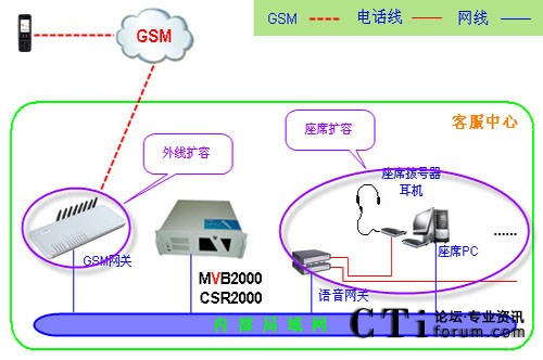 呼叫中心用于30路GSM網(wǎng)絡(luò)接入、20個(gè)座席人員使用,要求以后可擴(kuò)展到50座席人員或者更多。