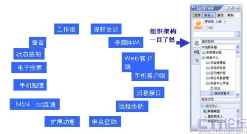 UcSTAR :Unified Communication Star,是深圳市擎旗信息技術(shù)有限公司推出的企業(yè)級(jí)融合通信平臺(tái)。是融合多種通訊手段(IM、文件、視頻、語(yǔ)音、EMAIL、SMS、電話、VOIP、MSN/QQ互通),融合企業(yè)的多種應(yīng)用系統(tǒng)緊密集成(OA、CMS、ERP、EIP、Portal、網(wǎng)站、應(yīng)用軟件),交流對(duì)象和交流內(nèi)容可管理,可控制,可擴(kuò)展,輕松實(shí)現(xiàn)部署企業(yè)的統(tǒng)一工作平臺(tái)。 UcSTAR能統(tǒng)一消息、統(tǒng)一溝通、統(tǒng)一管理、隨意選擇多種溝通手段,深航一直在找這樣的一種產(chǎn)品,公司信息部門從上到下給予極高的重視,商務(wù)的過程也都開了綠燈,一路順暢。