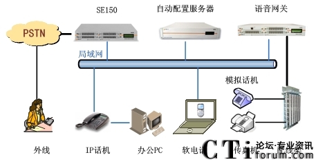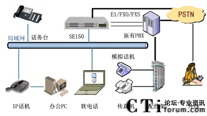 此方案適用于已經(jīng)部署了傳統(tǒng)PBX的企業(yè)。要求企業(yè)部署好數(shù)據(jù)網(wǎng)絡,如果采用模擬終端,則企業(yè)的各個辦公點需要先將網(wǎng)絡線路和電話線路部署到位,同時企業(yè)原有的PBX要預留與SE150對接的接口。