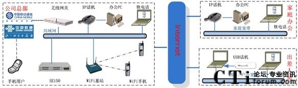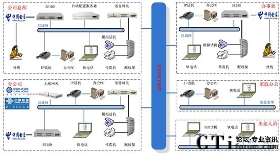 此方案適用于具有“移動辦公、頻繁出差、家庭辦公”需求的企業(yè)。系統(tǒng)要求企業(yè)內(nèi)部部署好數(shù)據(jù)網(wǎng)絡,如果采用模擬終端,則企業(yè)的各個辦公點需要先將網(wǎng)絡線路和電話線路部署到位。如果需要應用WIFI終端,則需要部署WIFI網(wǎng)絡。