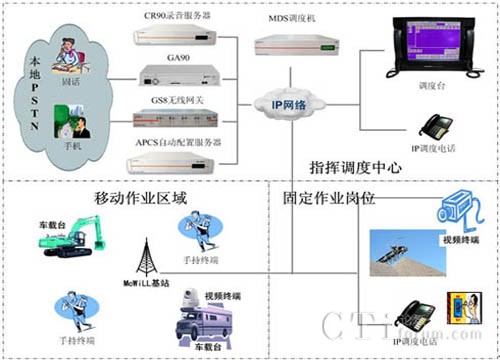 MDS系統(tǒng)可以應(yīng)用于各種作業(yè)現(xiàn)場的指揮調(diào)度, MDS系統(tǒng)不但支持系統(tǒng)基本的語音通信,調(diào)度中心可以通過視頻、數(shù)據(jù)、文本消息等綜合的多媒體方式與作業(yè)人員進行通信交互,滿足各種復(fù)雜環(huán)境下的指揮調(diào)度需求。系統(tǒng)可以通過GS8無線網(wǎng)關(guān)、GA90 E1/T1網(wǎng)關(guān)等設(shè)備實現(xiàn)與PSTN網(wǎng)絡(luò)的互聯(lián),滿足與手機和固話網(wǎng)絡(luò)用戶接入需要。豐富的終端類型可以滿足用戶對固定崗位、移動人員及車輛設(shè)備等不同環(huán)境的使用需求,根據(jù)人員崗位工作性質(zhì)可以配置IP調(diào)度話機、手持終端和車載臺等終端。