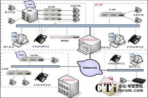 由于總部的網(wǎng)絡(luò)帶寬充足,因此部署了一臺(tái)核心IP PBX服務(wù)器——MCS1000。負(fù)責(zé)處理來(lái)自GA90、CN2x4、以及軟件電話(huà)的語(yǔ)音業(yè)務(wù)并給該系統(tǒng)配置一個(gè)公網(wǎng)的IP地址,適合于移動(dòng)辦公的公網(wǎng)用戶(hù),及沒(méi)有實(shí)現(xiàn)VPN的辦事處的接入,直接通過(guò)公網(wǎng)注冊(cè)到該核心系統(tǒng)上來(lái),然后通過(guò)相關(guān)的配置,統(tǒng)一管理下屬的語(yǔ)音終端設(shè)備。
