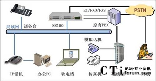 此方案適用于已經(jīng)部署了傳統(tǒng)PBX的企業(yè)。要求企業(yè)部署好數(shù)據(jù)網(wǎng)絡(luò),如果采用模擬終端,則企業(yè)的各個(gè)辦公點(diǎn)需要先將網(wǎng)絡(luò)線(xiàn)路和電話(huà)線(xiàn)路部署到位,同時(shí)企業(yè)原有的PBX要預(yù)留與SE150對(duì)接的接口。