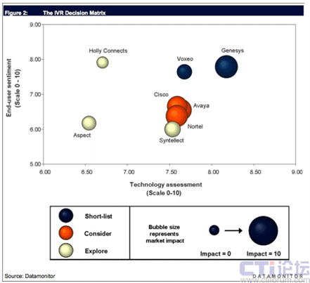 Datamonitor的分析數(shù)據(jù)顯示, 在參與評估的9家IVR應(yīng)用和服務(wù)提供商中,Genesys和Voxeo公司在技術(shù)實力、最終客戶滿意度和市場影響力三項的綜合評分處于領(lǐng)先,從而被Datamonitor推薦為最佳IVR應(yīng)用和服務(wù)提供商(如下圖所示)。