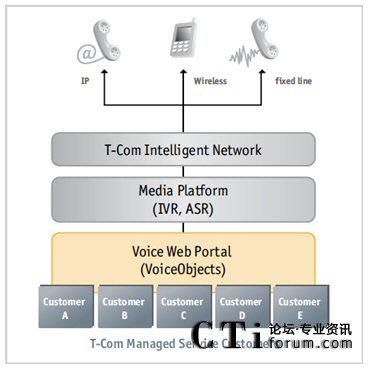 T-Com在2000年進(jìn)入競(jìng)爭(zhēng)激烈的受托管理業(yè)務(wù)市場(chǎng),并且很快從一個(gè)自產(chǎn)IVR系統(tǒng)過(guò)渡到開放標(biāo)準(zhǔn)的VoiceXML平臺(tái)。T-Com的標(biāo)語(yǔ)——“讓生活簡(jiǎn)單”——證明了要求給它的客戶及其每天1,000,000個(gè)呼叫提供7x24、可擴(kuò)展的和可靠的受托管理電話服務(wù)。但是,T-Com很快意識(shí)到需要額外的技術(shù)來(lái)補(bǔ)充這個(gè)新的VoiceXML平臺(tái)。