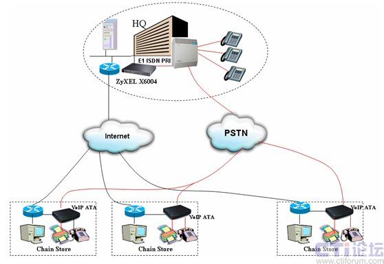 通過這種架構(gòu),各連鎖分店的話機(jī)與總部內(nèi)部話機(jī)之間的聯(lián)系便可以透過IP網(wǎng)絡(luò)進(jìn)行,無須再支付任何長途通話費(fèi)用。