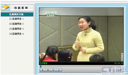 先在直播系統(tǒng)里啟動(dòng)設(shè)置好的01號(hào)頻道,其他教師就可以在各自辦公室通過(guò)計(jì)算機(jī)網(wǎng)絡(luò)觀(guān)看遠(yuǎn)教節(jié)目,不需淘神費(fèi)力地到專(zhuān)門(mén)的接收室了。如下圖: