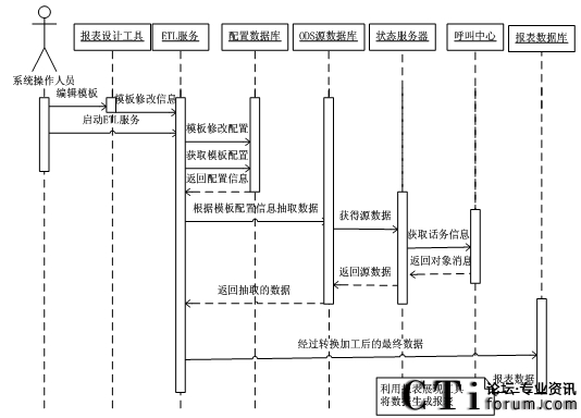 在ETL服務(wù)運(yùn)行時(shí),首先它會從配置數(shù)據(jù)庫中獲取模板的配置信息,并且根據(jù)其配置信息從ODS源數(shù)據(jù)庫中抽取數(shù)據(jù)。ODS源數(shù)據(jù)庫中的數(shù)據(jù)是狀態(tài)服務(wù)器從呼叫中心中獲得的。在ETL抽取數(shù)據(jù)后對其進(jìn)行轉(zhuǎn)換和加工,將其加載到報(bào)表數(shù)據(jù)庫中。并利用報(bào)表展現(xiàn)工具將報(bào)表數(shù)據(jù)展現(xiàn)出來。其最終設(shè)計(jì)的系統(tǒng)各部件交互時(shí)序圖如圖3.5所示。