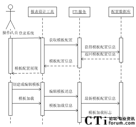 基于以上軟件體系結(jié)構(gòu),在系統(tǒng)操作人員利用報(bào)表設(shè)計(jì)工具編輯模板時(shí),報(bào)表設(shè)計(jì)工具將模板修改信息發(fā)送給ETL服務(wù),ETL服務(wù)會將修改配置數(shù)據(jù)庫中的模板配置。