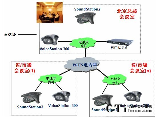 根據(jù)客戶的要求,本著“完善、經(jīng)濟、高效”的原則,我們制定了以下解決方案;系統(tǒng)利用傳統(tǒng)電話網(wǎng)絡,擁有自己的會議管理系統(tǒng);北京總部方面使用Polycom SS2基本型商務會議電話;各個省/市級分會場,根據(jù)自己會場的情況自選設備;