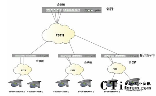 根據(jù)客戶需要在降低會議成本的前提下實(shí)現(xiàn)快速、便捷、實(shí)時的多點(diǎn)之間多人會議溝通的需求,我們制定了以下解決方案;系統(tǒng)利用傳統(tǒng)電話網(wǎng)絡(luò),是客戶擁有自己的會議管理系統(tǒng);省行方面使用Polycom SS2基本型商務(wù)會議電話或普通模擬電話;各個市/縣級分行,根據(jù)自己會場的情況自選設(shè)備。