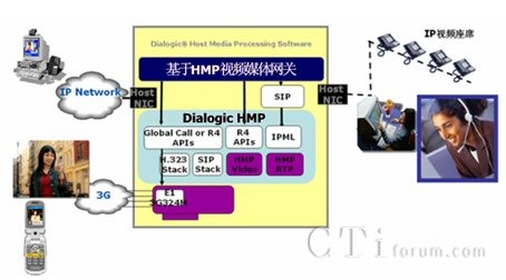 基于Dialogic HMP(Host Media processing)主機(jī)媒體處理技術(shù)的視頻呼叫中心主要通過網(wǎng)絡(luò)接口卡(“瘦卡”,Digital Network Interface卡)與PSTN(3G)相連。這里的PSTN包括電信、聯(lián)通和移動(dòng)等電信運(yùn)營商。也可以通過H.323、SIP協(xié)議棧直接接受來自數(shù)據(jù)網(wǎng)絡(luò)的多媒體呼叫。