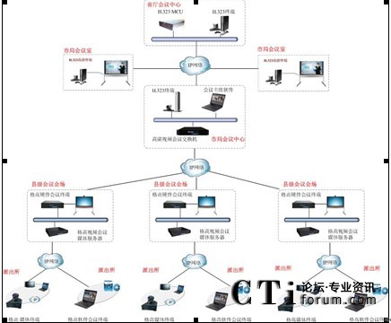 公安視頻會議系統(tǒng)建設(shè)主要依托現(xiàn)有的寬帶IP網(wǎng),建設(shè)從市局到各縣區(qū)分局及各鄉(xiāng)鎮(zhèn)派出所之間的交互式視頻會議系統(tǒng),最終建成的系統(tǒng)要實現(xiàn)全省公安系統(tǒng)每個點都能互通。
