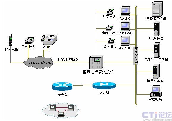 根據(jù)外包呼叫中心初期建設(shè)需求,基于HXD09交換機(jī)系統(tǒng)的客戶服務(wù)中心的網(wǎng)絡(luò)拓?fù)浣Y(jié)構(gòu)如下圖所示: