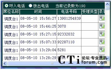 當(dāng)電話打進(jìn)來,話務(wù)員提話機(jī)時(shí)系統(tǒng)便自動(dòng)進(jìn)行錄音,系統(tǒng)把語音信號(hào)以數(shù)字化語音格式寫入硬盤。同時(shí)系統(tǒng)記錄其通話日期、摘機(jī)時(shí)間、掛機(jī)時(shí)間和當(dāng)前通話時(shí)間等信息,如果該次電話為打出電話,還可記錄其打出的電話號(hào)碼。當(dāng)值班人員掛機(jī)時(shí)系統(tǒng)便會(huì)自動(dòng)停止錄音。