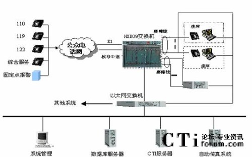 綜合接警平臺主要由hxd09可編程智能語音交換機和計算機網(wǎng)絡兩部分組成,交換機負責110、119、122報警電話的接入與分流及調(diào)度呼出等功能;計算機網(wǎng)絡則完成110、119、122報警信息的顯示、數(shù)據(jù)儲存、統(tǒng)計及信息查詢、發(fā)布功能。