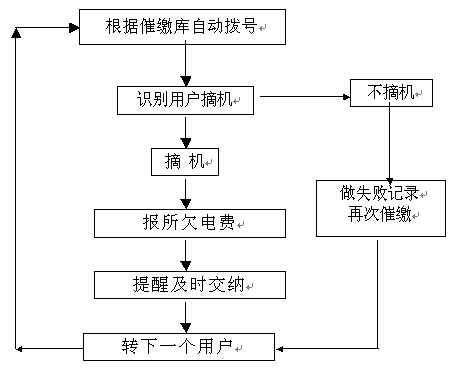 。。催費(fèi)工作是由指定的欠費(fèi)數(shù)據(jù)文件(或欠費(fèi)數(shù)據(jù)庫(kù))中提取用戶電話號(hào)碼和欠費(fèi)金額,自動(dòng)順序向各欠費(fèi)用戶撥號(hào),撥通后自動(dòng)播放催費(fèi)通知并通報(bào)欠費(fèi)金額數(shù)。系統(tǒng)自動(dòng)統(tǒng)計(jì)通話結(jié)果,系統(tǒng)對(duì)未應(yīng)答用戶會(huì)自動(dòng)重復(fù)多次撥叫。