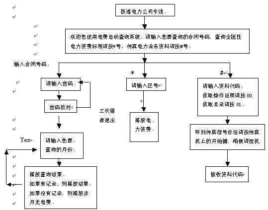 。。當(dāng)用戶得知需要繳納電費(fèi)時(shí),可撥打電力公司查詢熱線,聽(tīng)到問(wèn)候語(yǔ)后輸入合同號(hào)碼,系統(tǒng)即可自動(dòng)播放用戶查詢?cè)路莸碾娰M(fèi)發(fā)生情況。