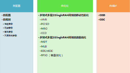 SingleSON主要包括下述3類特性,即自配置,自優(yōu)化和自維護(hù),如下圖所示: